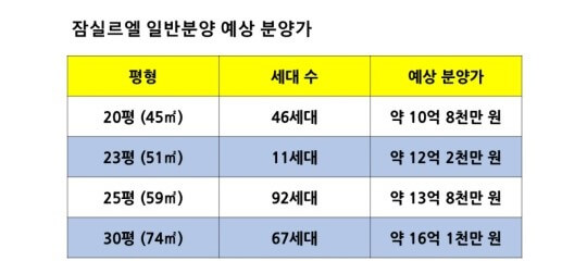 장래아 기준(평당 5,409만 원) 예상 분양가는 아래와 같습니다.